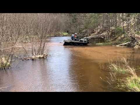Покупатель в Канаде снял отличное обзорное видео вездехода. Езда по кучам подтаявшего снега высотой более метра. Езда по лесу. Спуск в реку по достаточно крутому берегу. Преодоление водных преград. Выход из воды. Первая часть видео снята третьим лицом, вторая от первого лица из кабины.